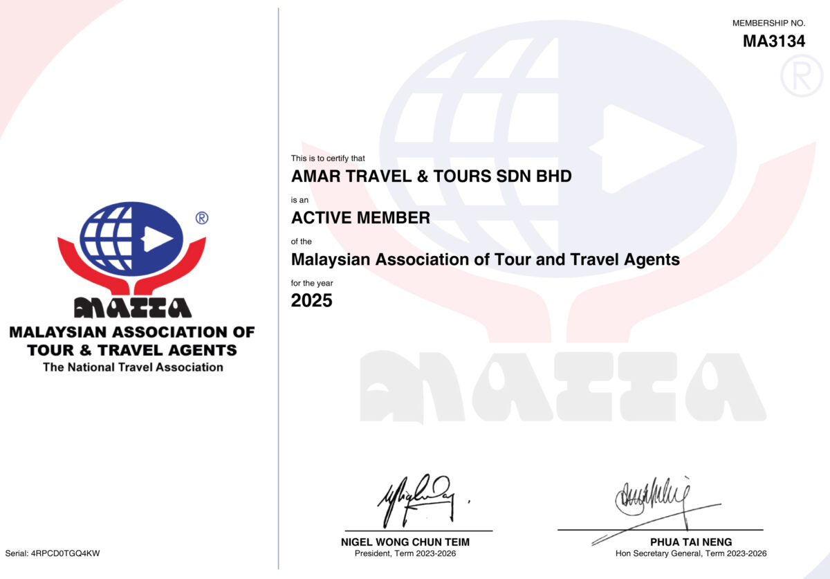 AmarTrips merupakan penyedia perkhidmatan pelancongan yang berlesen dan bertauliah, serta berdaftar sepenuhnya di bawah pihak berkuasa pelancongan tempatan. Kami memiliki lesen operasi pelancongan rasmi dan mematuhi piawaian industri yang ketat – memberi jaminan bahawa anda membuat tempahan dengan syarikat yang sah, boleh dipercayai dan profesional.Bercutilah dengan tenang, disokong oleh kelayakan dan pengiktirafan yang boleh disahkan.